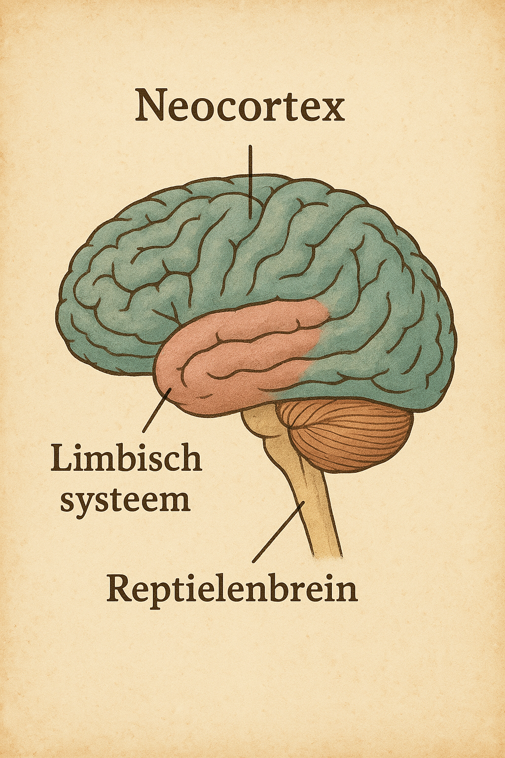 - Het limbisch systeem: meer naar het midden van het brein ligt ons emotionele centrum. Hier ontstaan gevoelens, herinneringen en de behoefte aan verbinding met anderen.